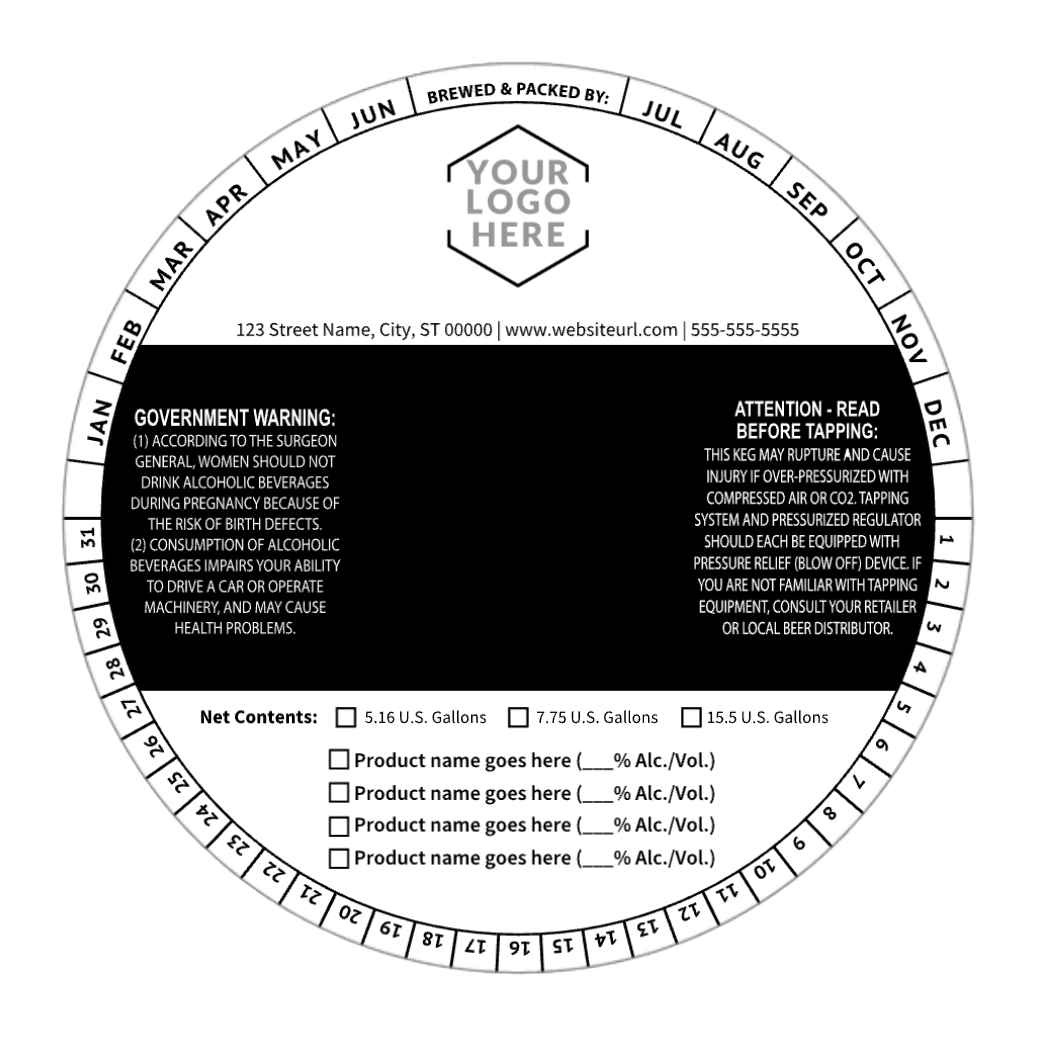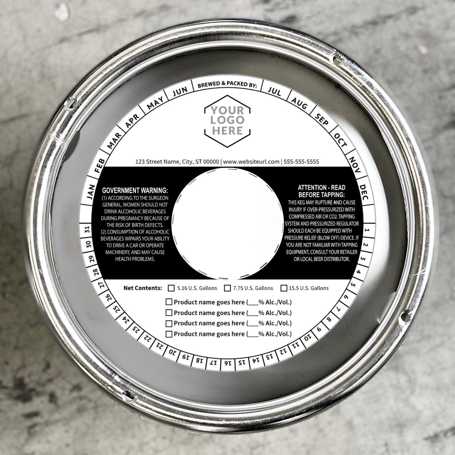 Enhance your keg's look with our 7-inch Round Keg Collar. Featuring a black and white striped design, you can personalize the color scheme and net contents. The blank area at the bottom offers extra space for your unique branding or details. Crafted from eco-friendly, high-quality paper stock, these collars combine style and utility.